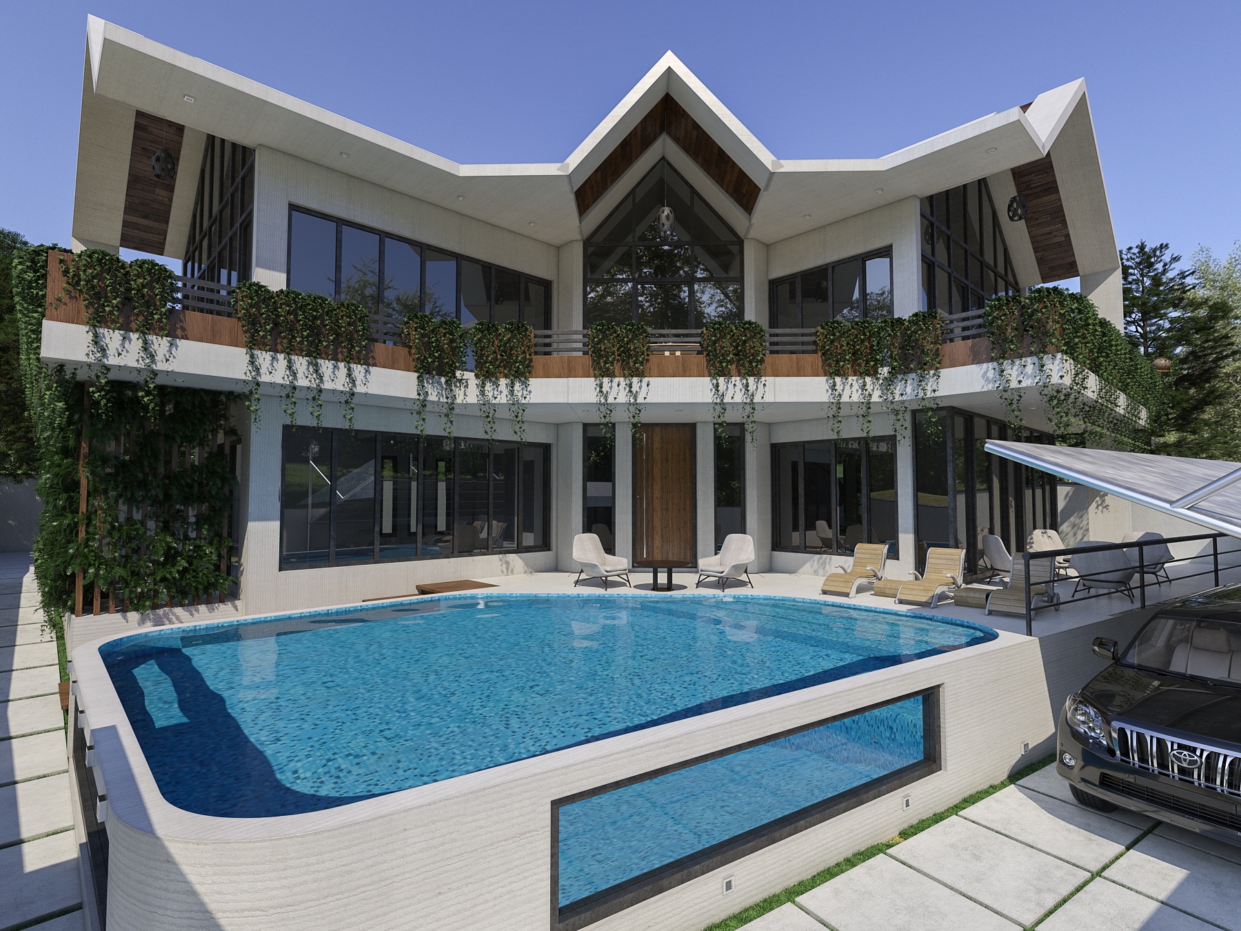 This villa project extends across a plot of approximately 430 square meters. The architectural concept was developed with the aim of creating a strong connection between interior and exterior spaces. An extroverted building structure was chosen to make this connection spatially tangible. At the center of the design is an integrated terrace with a generously cantilevered roof. This arrangement created a spatial structure divided into three zones: the open outdoor area, the semi-open terrace with veranda, and the enclosed living space. The transitions between these zones were deliberately designed to be fluid to allow for flexible daily use. The roof element was designed to harmoniously blend into the overall structure while adding visual stability and structural clarity from the outside. Materials such as wood and selectively placed greenery were used to reference regional building traditions and to support a warm, livable atmosphere.
